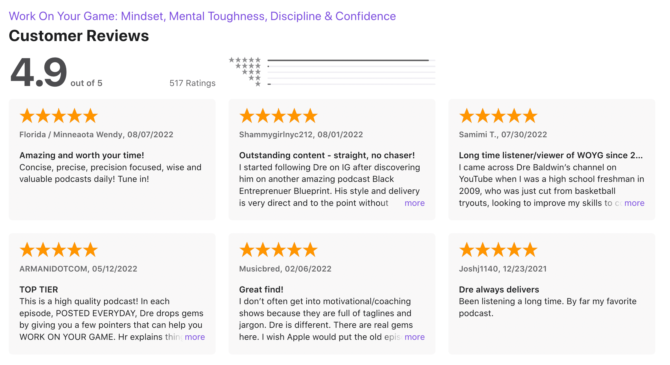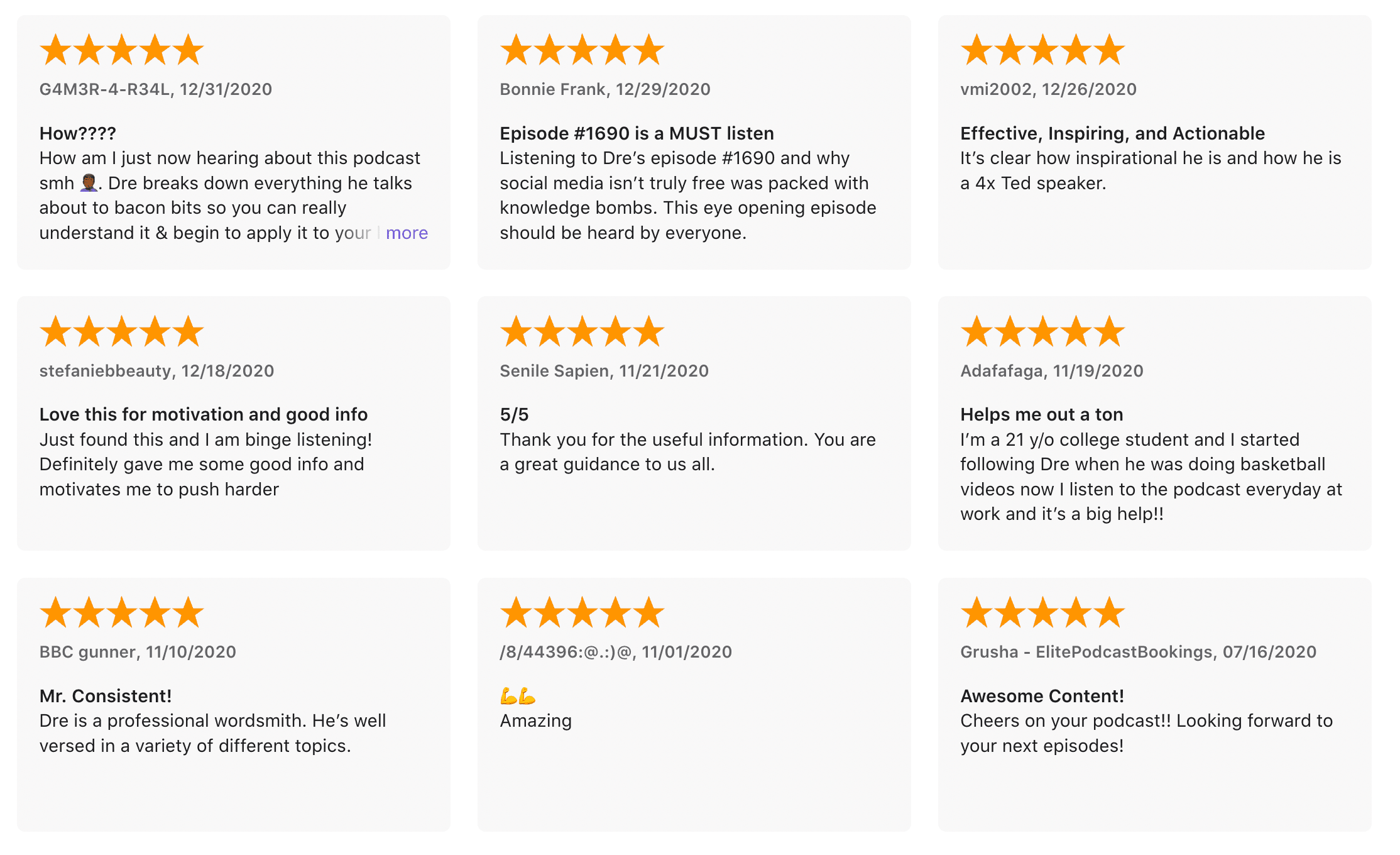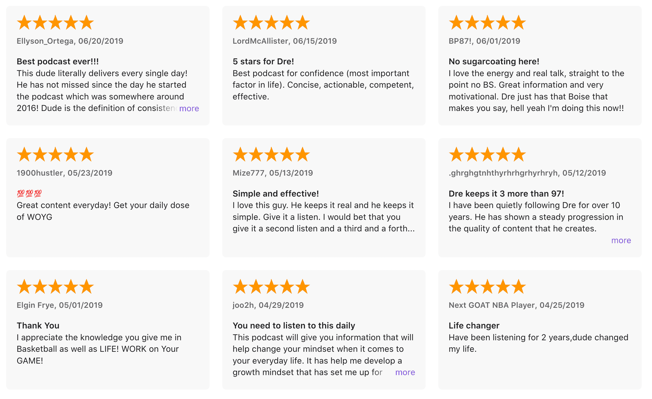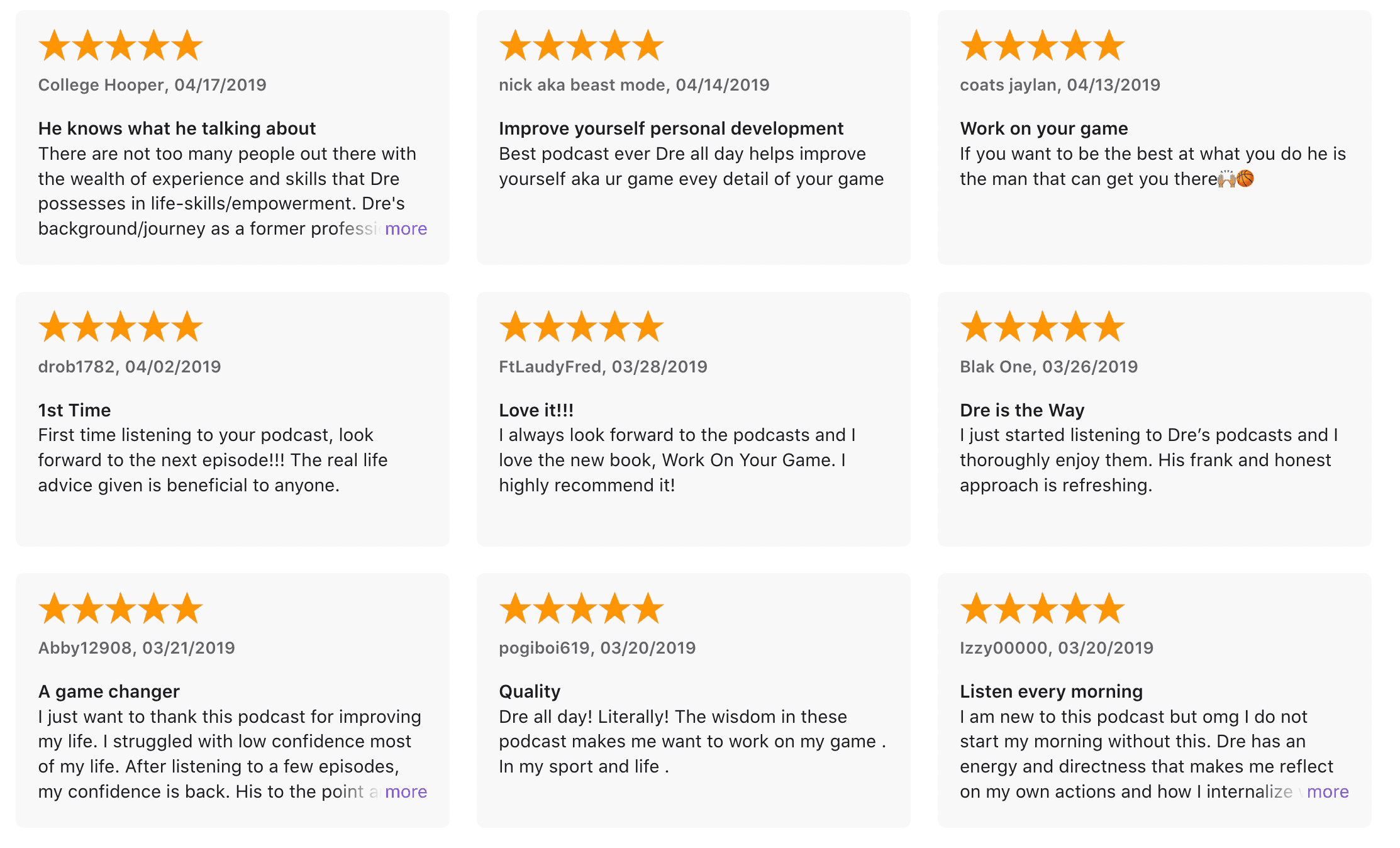 Dre's daily Work On Your Game Podcast has over 2,300 episodes and more than 5 million downloads.